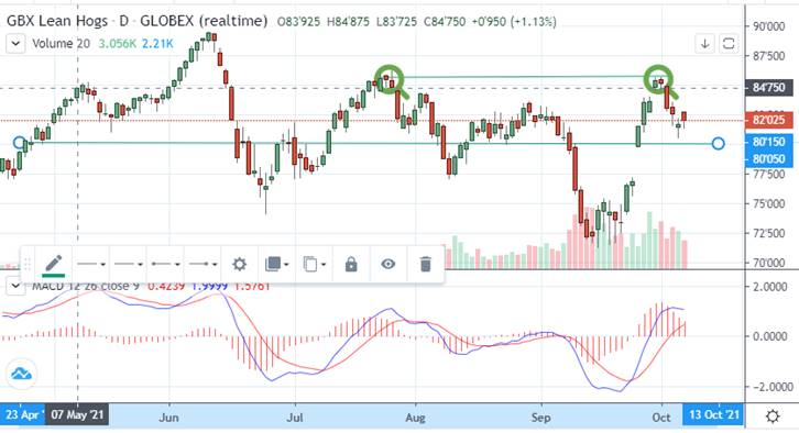 Techniquement, les contrats à terme ont refusé de grimper au-dessus des sommets du mois dernier. Quand on regarde, l’action des prix sur le graphique du contrat de décembre 2021, on note que l’objectif du prix à $85.50 USD / 100 lbs a été atteint. Le marché va vouloir tester le support @ 80.15 pour voir la solidité de celui-ci. Mais le marché a horreur du vide et pourrait être tenté de baisser pour rejoindre le niveau de $77.00 afin de fermer la fenêtre créée lors de la publication du rapport Hog & Pig le mois dernier. Le Momentum haussier est plus difficile à reprendre, mais pas impossible. Il faudra surpasser le niveau de $85.50 pour potentiellement revoir les sommets de cet été. Il faudra des fortes nouvelles pour créer ce mouvement.