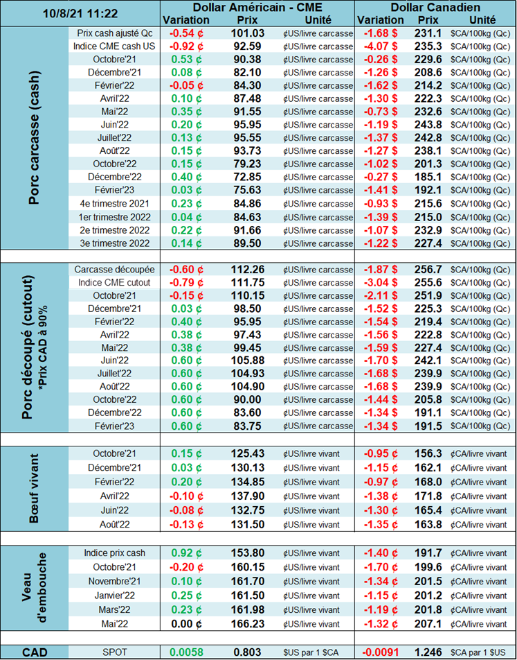 Le USDA regarde l’idée d’offrir des passe-droit pour accélérer la cadence d’abattages aux abattoirs qui peuvent démontrer que la sécurité des travailleurs est respectée et que le contrôle des bactéries se fait de façon efficace. Trump avait permis l’accélération des abattages, les inspecteurs du USDA et les travailleurs avaient gagner leur cause en cours et avaient réduit le rythme, mais voilà que le USDA veut contourner le tribunal. (https://www.thepigsite.com/news/2021/10/usda-secretary-mulls-waivers-for-pork-plants-forced-to-use-slower-line-speeds) Le rythme pourra vraisemblablement changer usine par usine au cours des prochaines semaines. Si jamais cela s’avérait, il ne faudrait pas se surprendre de revoir une demande plus forte pour les porcelets et éventuellement une offre de porcs plus élevés de la part des producteurs.