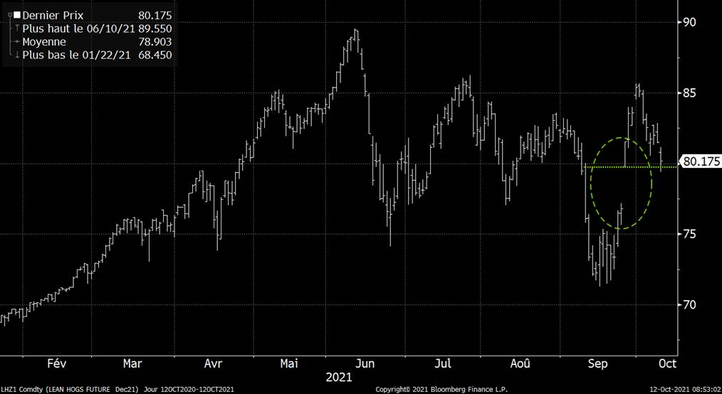 Le momentum haussier qu’a connu le prix du porc après la publication du Hogs & Pigsn’a pas duré très longtemps, nous sommes de retour au même niveau qu’à l’ouverture suivant le rapport. Toutefois, c’est un pivot important à savoir si on va venir remplir le « gap » du 27 septembre ou pas, c’est un support technique important. En autant que le prix de décembre reste au-dessus de 80 cents/lb, il n’y a de signaux de vente, mais il faut s’attendre à ce que le prix pourrait baisser rapidement entre 80 et 75 cents en raison des signaux techniques. La zone 80 à 70 cents semble la plus à risque puisqu’à moins d’un cas de PPA aux États-Unis, le prix ne devrait pas s’effondrer en raison de la baisse de la production des prochain mois. Il est possible d’acheter le put spread 80 – 70 sur décembre pour 2.5 cents, limitant la perte si jamais le prix remonte tout en étant protégé jusqu’à 70 cents/lb.