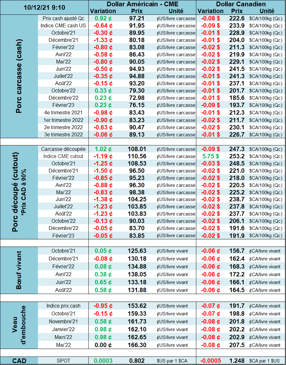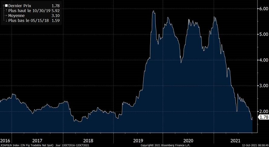 La chute du prix du porc en Chine semble se stabiliser après une chute du niveau stratosphérique de 550 $US/100kg en janvier à 178 $US/100kg aujourd’hui! Avec un prix inférieur au prix américain, mais un coût d’alimentation nettement supérieur, la rentabilité n’est pas au rendez-vous pour les éleveurs chinois. De la sorte, en août, le cheptel reproducteur s’est contracté par -0.9% et ce, après une baisse de -0.5% en juillet. On s’attend déjà à ce que la Chine n’achète plus de porc américain et/ou canadien, mais c’est toujours nébuleux de savoir où ira l’augmentation de production européenne et brésilienne qui était dédiée à la Chine… La compétition sur le marché d’exportation sera féroce en 2022.