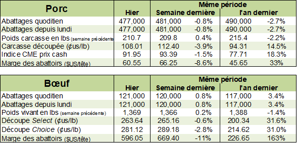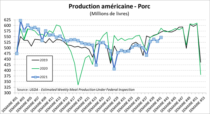 Aux États-Unis, la production porcine demeure relativement faible, nettement en-dessous des volumes de 2019 et 2020. Les abattages étaient de 2.6 millions de porcs contrairement à 2.73 millions l’an dernier, c’est une différence de -4.8%. De plus, le poids est beaucoup plus bas cette année avec une moyenne de 210.6 lbs/carcasse, soit 5 livres de moins que l’an dernier. Au final, la production est seulement de 547 millions livres, en baisse de 7% par rapport la même semaine l’an dernier et 4% de moins qu’en 2019.
