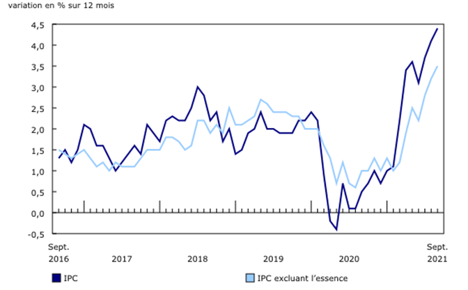 D’ailleurs aujourd’hui au Canada, on apprend que l’inflation est à son plus haut depuis presque 20 ans. « Après avoir progressé de 4,1 % d'une année à l'autre en août, l'Indice des prix à la consommation (IPC) a augmenté de 4,4 % en septembre, soit le taux le plus élevé depuis février 2003. ». Il faudrait comme monter les taux d’intérêt…. Sauf qu’on n’est pas encore sorti du trou, et si on monte les taux « trop tôt » on risque que tout s’écroule financièrement. Alors on laisse l’inflation rouler, en se croisant un peu les doigts que ça va bien aller.