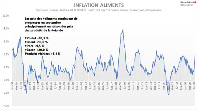 On le ressent aussi dans le panier d’épicerie « Les prix des aliments continuent de progresser en septembre principalement en raison des prix des produits de la viande ». Et pour moi, ce n’est vraiment pas terminé car AUCUNE des causes qui sont responsable de l’augmentation du cout de la vie sont réglé.