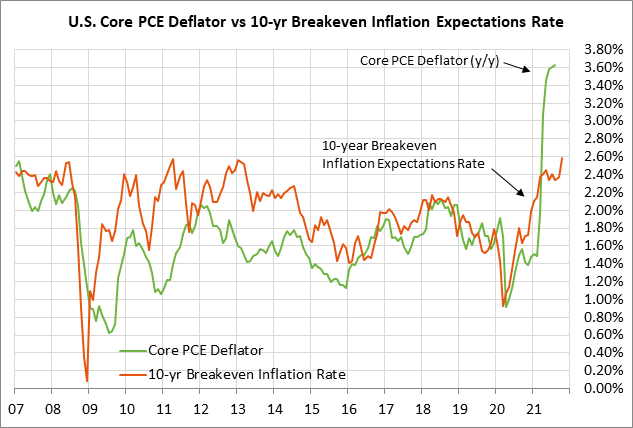 Alors que la Fed continue d'insister sur le fait que la poussée de l'inflation sera temporaire, les marchés ont poussé le point mort des attentes d'inflation à 10 ans à une forte hausse au cours des dernières semaines. Le taux d'équilibre a atteint mercredi un nouveau sommet de 9 ans à 2,70 %, bien qu'il ait ensuite fortement chuté jeudi à 2,59 %.