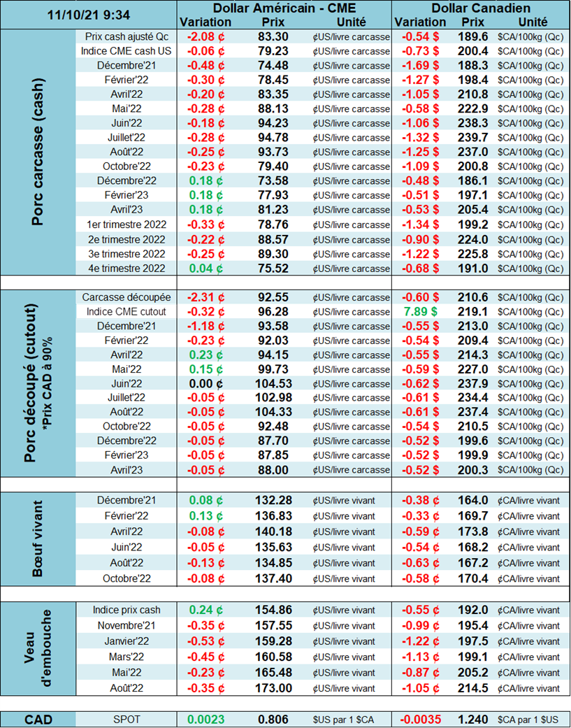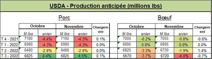 Au final, peu de changement significatif par rapport aux données du mois d’octobre, mais par contre cela continue de justifier un maintien des prix relativement élevés des viandes pour terminer l’année 2021. On note que la quantité de viandes rouges (porc et bœuf) semble maintenant plus bas que les estimations du mois d’octobre.
