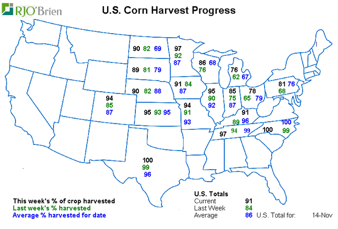 - Maïs récolté 91%, 84% la semaine dernière, 86% en moyenne