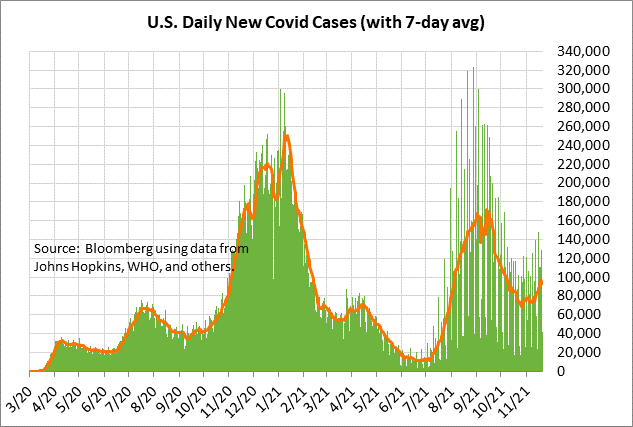 La pandémie américaine s'aggrave alors que les infections à Covid atteignent un sommet en 6 semaines - La pandémie s'est aggravée au cours des trois dernières semaines, la moyenne sur 7 jours des nouvelles infections Covid aux États-Unis atteignant jeudi dernier un sommet en 6 semaines de 97 006. C'était en hausse de +42% par rapport au plus bas des 3-1/2 mois de fin octobre à 68 274.