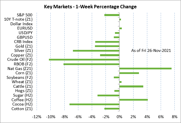Focus sur le marché -- Les marchés cette semaine se concentreront sur (1) la mesure dans laquelle la variante Omicron Covid pourrait aggraver la pandémie mondiale, (2) l'agenda de Washington qui comprend la prévention d'une fermeture du gouvernement ce vendredi et le relèvement du plafond de la dette de 15 décembre (3) un calendrier économique chargé plafonné par le rapport de paie de novembre de vendredi (attendu +550 000), (4) les implications de la variante Omicron Covid pour la politique de la Fed.