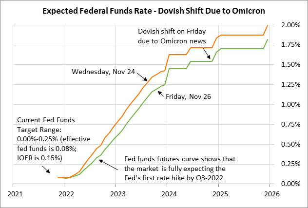 Les marchés deviennent soudainement plus accommodants vis-à-vis de la politique de la Fed en raison de la menace Omicron - Vendredi dernier, les marchés ont pris un virage accommodant alors que la menace Omicron a provoqué une chute de -2,3% du S&P 500 et une baisse de -16 pb du T- à 10 ans. note rendement à 1,47 %. Vendredi dernier, le contrat à terme sur les fonds fédéraux de décembre 2022 (sur la base du rendement) a fortement chuté de -16 pb à 0,56%, ce qui signifie que les marchés ont réduit les attentes de resserrement de la Fed de plus de la moitié d'une hausse des taux d'ici la fin de 2022. Les marchés s'attendent désormais à une hausse globale des taux de 48 pb d'ici la fin 2022 par rapport au taux effectif actuel des fonds fédéraux de 0,08 %, soit moins que la hausse des taux de 64 pb attendue mercredi dernier avant que les marchés ne réagissent à la variante Omicron.