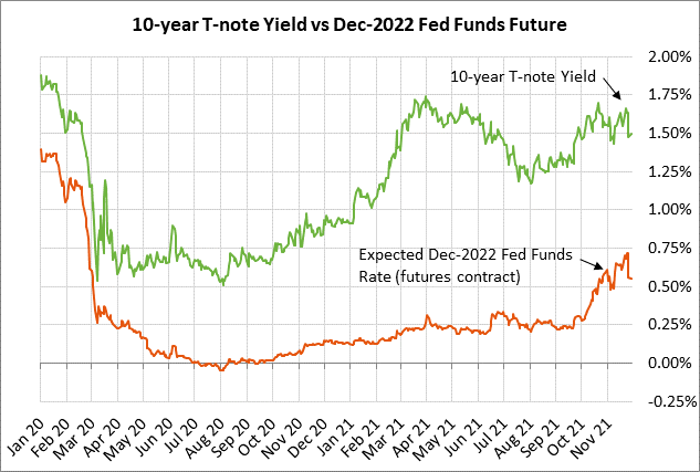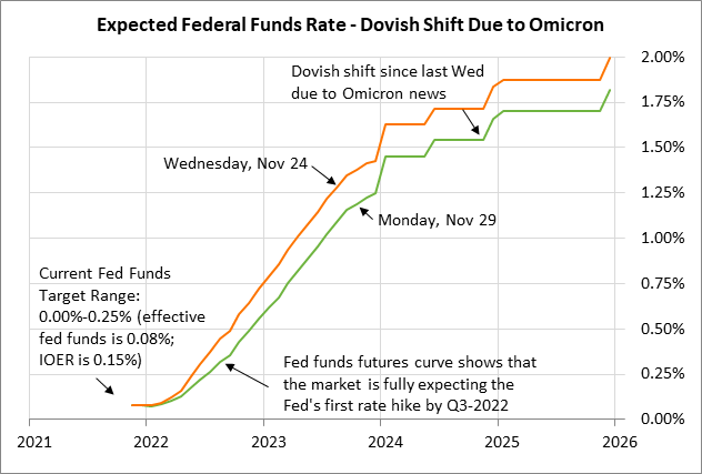 Avant que la variante omicron ne devienne un problème majeur vendredi dernier, divers responsables de la Fed ont déclaré qu'ils envisageraient sérieusement d'accélérer le rythme de réduction du QE de la Fed en raison de la vigueur de l'économie et de la persistance d'une inflation élevée. La Fed a commencé en novembre à réduire son programme d'assouplissement quantitatif à 15 milliards de dollars par mois, un rythme qui signifierait que le programme d'assouplissement quantitatif serait terminé en juin 2022.