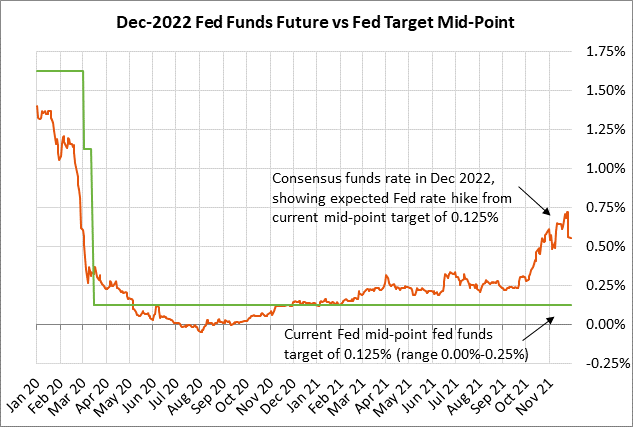 Le contrat à terme sur les fonds fédéraux de décembre 2022 a clôturé lundi à 0,56 % (sur la base du rendement), ce qui signifie que les marchés s'attendent à une hausse globale des taux de 48 pb d'ici la fin de 2022 par rapport au taux effectif actuel des fonds fédéraux de 0,08 %. C'est 16 pb de moins que la hausse des taux de 64 pb attendue mercredi dernier avant que les marchés ne réagissent à la variante omicron. Les marchés anticipent actuellement la première hausse des taux de la Fed au T3-2022 et la deuxième hausse des taux d'ici la fin du T4-2022.
