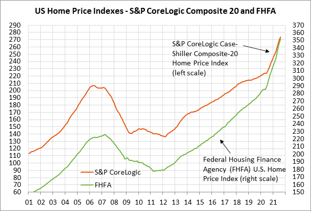 Les prix des logements aux États-Unis devraient afficher une autre forte augmentation - Les indices des prix des logements aux États-Unis d'aujourd'hui devraient tous deux afficher de fortes augmentations de +1,2% m/m, s'ajoutant à l'augmentation de +1,0% m/m observée dans l'indice des prix des logements FHFA en août et l'augmentation de +1,2% m/m observée dans l'indice des prix des logements S&P CoreLogic composite-20. En glissement annuel, l'indice FHFA est en hausse de +18,5 % en août et l'indice Composite-20 de +19,7 %. Les prix des maisons continuent d'augmenter en raison de la forte demande et de l'approvisionnement serré.