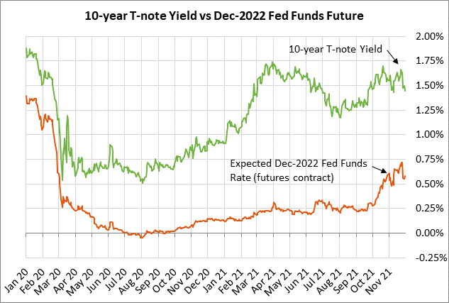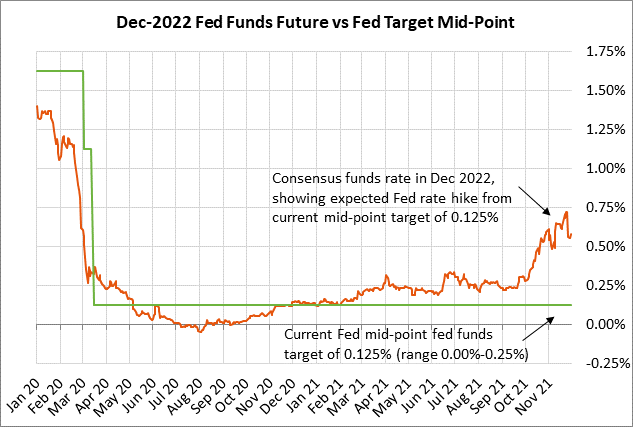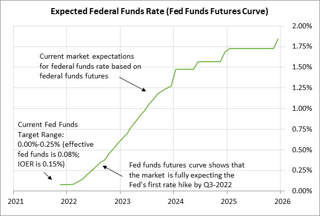 Le contrat à terme sur les fonds fédéraux de décembre 2022 a clôturé mardi à 0,58 % (sur la base du rendement), ce qui signifie que les marchés s'attendent à une hausse globale des taux de 50 pb d'ici la fin de 2022 par rapport au taux effectif actuel des fonds fédéraux de 0,08 %, avec un Hausse des taux de 25 pb au T3 et une deuxième hausse au T4.