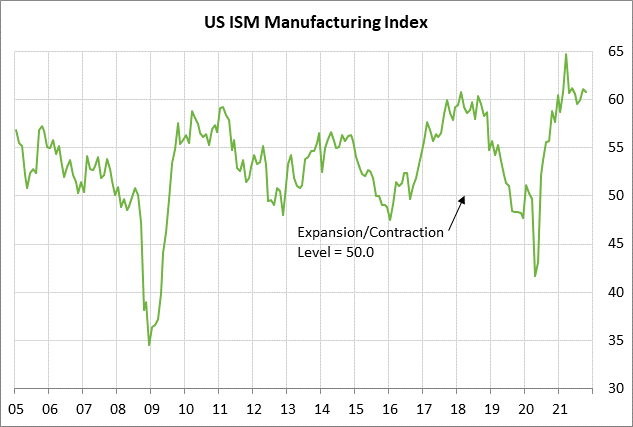 L'indice ISM manufacturier américain devrait rester solide - Le consensus est que l'indice ISM manufacturier de novembre d'aujourd'hui affichera une augmentation de +0,4 point à 61,2, soit plus qu'une inversion de la baisse de -0,3 d'octobre. Le secteur manufacturier américain reste solide malgré les obstacles liés aux contraintes de la chaîne d'approvisionnement et aux retards de transport.