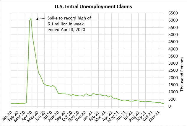 La série de réclamations initiales n'est que de 28 000 au-dessus du creux de 52 ans de 194 000 affiché au cours de la semaine terminée le 19 novembre, montrant que les licenciements sont à leur plus bas niveau en cinq décennies. Les entreprises se concentrent sur l'embauche d'employés aussi rapidement qu'elles le peuvent et ne sont certainement pas en train de licencier les employés existants.
