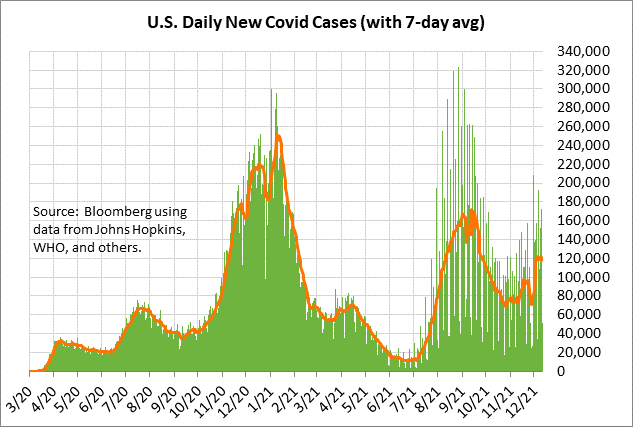 La moyenne sur 7 jours des nouvelles infections à Covid aux États-Unis a atteint un sommet de 2 1/2 mois de 122 307 le 5 décembre et est actuellement juste en dessous de ce niveau. Les infections à Covid étaient déjà en augmentation avant l'émergence d'omicron en raison des vacances de Thanksgiving et de facteurs saisonniers. Cependant, la propagation de l'omicron est maintenant susceptible de maintenir de nouveaux niveaux d'infection élevés.