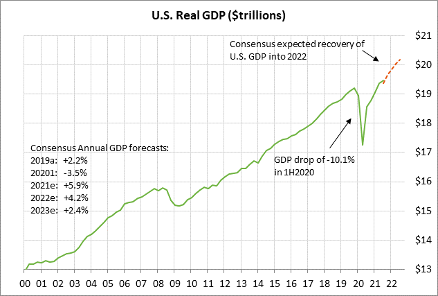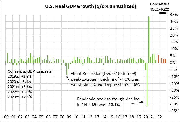Pour l'avenir, le PIB au T4 devrait bondir à +6,0% (t/t annualisé). Cependant, la croissance du PIB ralentirait ensuite à +4,0% au T1-2022, +3,6% au T2, +3,2% au T3 et +2,6% au T4. Sur une base d'année civile, la croissance du PIB américain devrait afficher une très forte croissance de +5,6% en 2021, mais devrait ensuite décélérer à +3,9% en 2022 et +2,5% en 2023.