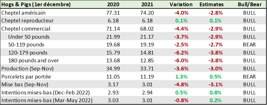 Le rapport USDA de la semaine dernière le Hogs & Pigs du 23 décembre a fait varier les prix, mais sans trop de surprise ou de feux d’artifice. Le rapport était positif pour les prix, ça on s’en doutait. Le cheptel américain est plus petit, une baisse de -4% par rapport à l’an dernier. Plus petit troupeau, moins de production et donc un équilibre de prix normalement plus élevé. Il nous manquait juste la réaction du marché car vendredi dernier la bourse était fermée. Donc aujourd’hui était la première fois qu’on pouvait transiger le porc en aillant les données mise à jour de l’USDA. Le marché est cohérent, les prix ont monté aujourd’hui, mais on parle de hausse plutôt légère d’environ 1 cent la livre tout au plus.