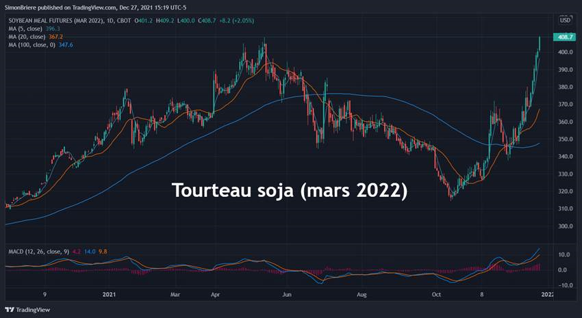 Les inventaires américains (ou mondiaux) ne sont pas à des niveaux nécessairement critiques. Par exemple aux USA les inventaires de maïs sont à 1.5 milliard; c’est plus faible que les 2.5+ des dernières saisons mais demeure sommes toute « adéquat ». La grande différence c’est qu’il n’y a pas vraiment de place à l’erreur si jamais la consommation est plus forte, ou que la récolte est un peu moins bonne. C’est la même chose pour le soja; il y en a, mais il n’y en a pas tant en extra. Cette réalité rend le marché plus nerveux, plus réactif à quoi que ce soit et donc les variations de prix peuvent être un peu plus grande (à la hausse comme à la baisse) dans ce contexte. Les chaînes d’approvisionnement étant encore sous forte pression, les acheteurs ont tendance à être un peu plus rapide sur la gâchette ; la peur d’en manquer, ou la peur que le stock arrive en retard donne le gout d’peser sur le piton plus vite que trop tard.
