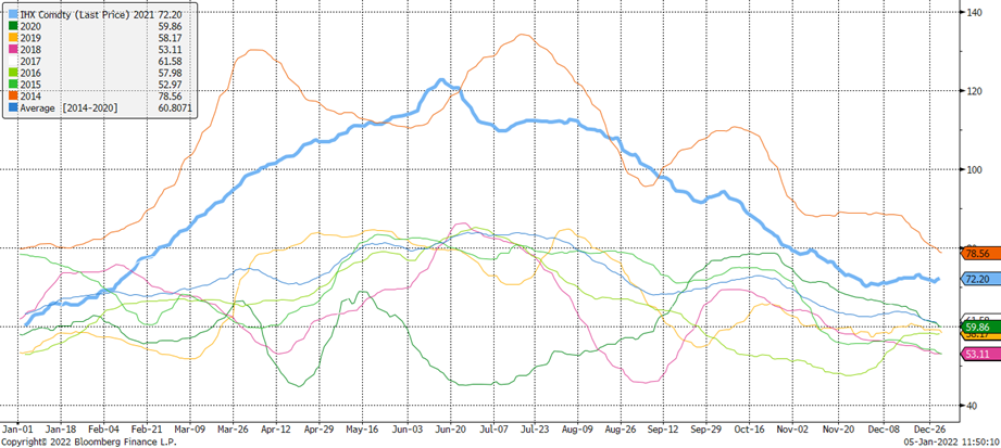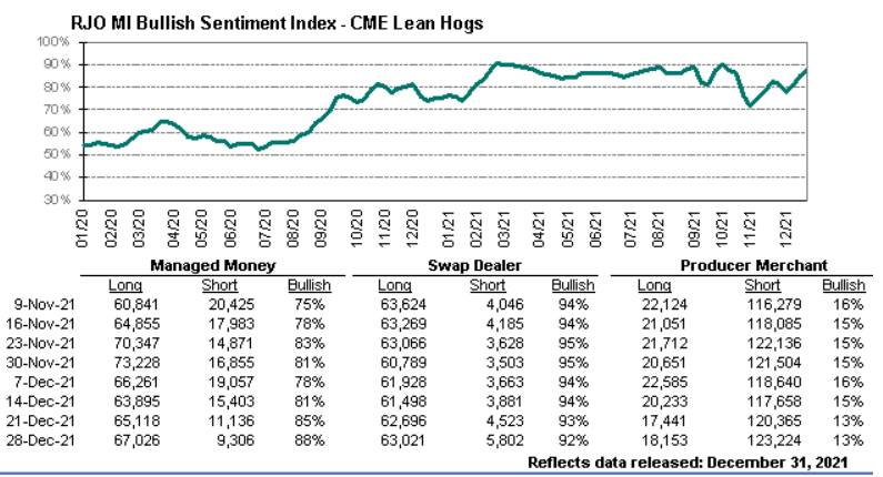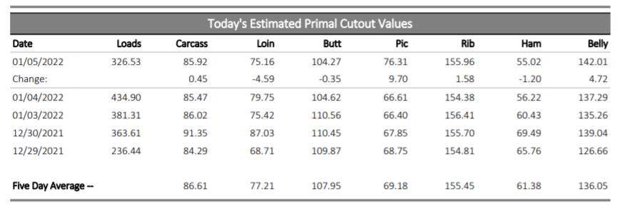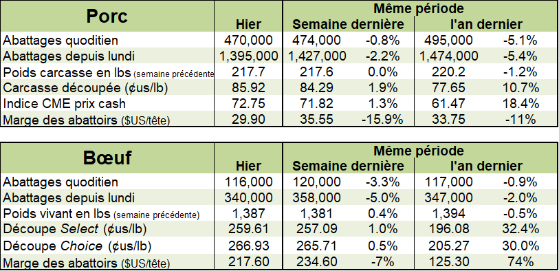 Évidemment le marché d’exportation a tourné un peu au ralenti en raison de la fin d’année. Dans le rapport hebdomadaire, le USDA a rapporté des ventes à l’exportation qui se chiffraient à 19 400 tonnes métriques. Si nous avions été une semaine normale, le chiffre aurait été décevant, mais puisque nous étions pendant le temps des Fêtes, ce nombre est très satisfaisant quand on le compare aux autres denrées agricoles (mais, blé, soya, etc.) Le USDA continue de croire à une hausse des exportations de viandes de porc en 2022. L’organisme projette une hausse de 3% versus 2021. Compte tenu du contexte de réduction du nombre de porcs abattus aux États-Unis, le contexte demeure favorable pour le maintien des prix pour les prochains mois.