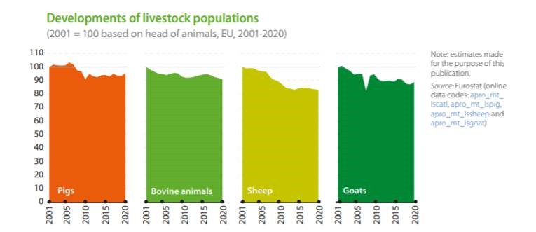 Pour ceux qui veulent lire une petite brique d’information sur l’agriculture européenne, il y a une étude qui vient de sortir sur l’évolution de la production en Europe (2001 – 2020) (en anglais pour l’instant – j’imagine que la traduction ne saurait tarder). On peut retrouver ce tableau sur la décroissance de tous les cheptels animaliers en Europe depuis 20 ans. Moins de porcs, moins de bœufs et vaches, moins de moutons et moins de chèvres. C’est une trajectoire que l’Amérique du Nord pourrait suivre au cours des prochaines années avec la montée des groupes véganes, le bien-être animal, le vieillissement des producteurs (l’âge moyen est élevé), notre sensibilité aux mouvements environnementaux, etc. Tous ces facteurs contribuent à une diminution de la production.