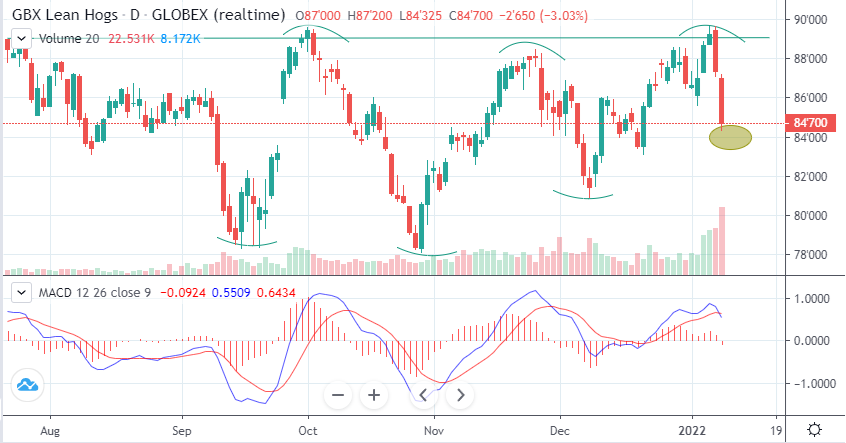 Le marché dans le porc était fatigué de monter. La hausse depuis le début du mois de décembre vient à son terme. Le marché corrige et l’idée de l’analyse technique essaie de déterminer jusqu’à quel niveau cette correction peut se poursuivre. Le graphique du contrats du mois d’avril propose un support autour du niveau de $84.00 USD / livre. Si jamais ce niveau ne voulait pas contenir les vendeurs, il est possible d’atteindre le niveau de $81.85 USD. Les fonds d’investissement essaient de rebalancer leur portefeuille en ce début d’année 2022.