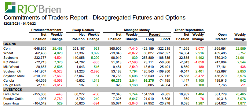 Par contre, plusieurs grandes firmes d’investissement indiquent vouloir encore une fois cette année mettre l’emphase sur les investissements dans les commodités. Nous verrons si ces joueurs majeurs continuer d’empiler des contrats dans les commos agricoles (mais , soya, blé, sucre, coton, porc er bœuf, etc). Les investisseurs jouent le jeu de l’inflation alimentaire et achètent des contrats à terme pour limiter les impacts des hausses ou pour l’alimenter davantage. Ces spéculateurs possédaient près de 56 000 contrats acheteurs.