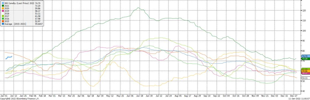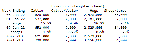 Les abattages demeurent aussi relativement faibles par rapport à 2021, mais sont proches des données du USDA. Évidemment nous n’avons qu’UNE semaine en 2022 pour comparer donc ca ne veut pas dire grand-chose.