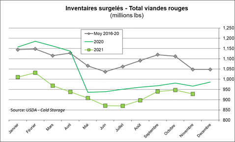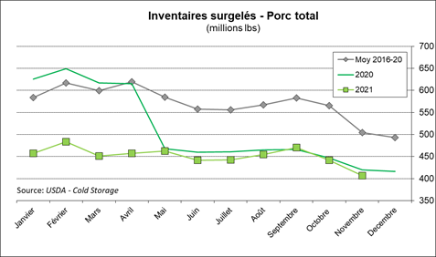 Et pour terminer, les inventaires de porc, rapportés le 22 décembre dernier, suggèrent que ceux-ci demeurent très bas et pourraient rester ainsi pendant encore longtemps.