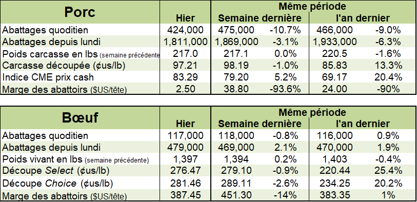 Une note intéressante sur un point que je suis attentivement : le poids moyen des porcs abattus. Ca commence à parler un peu plus depuis 1 semaine… le poids de la carcasse est plus élevée, mais le poids moyens vivant demeurent inchangé ou en baisse par rapport à l’an dernier.