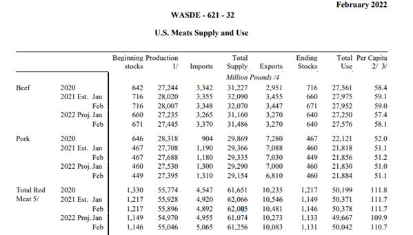 Mais revenons plus spécifiquement au porc. Le USDA la semaine dernière a ajusté à la baisse la production pour 2021 et 2022. On parle d’une baisse de 20 millions de livres entre le rapport de janvier et celui de février (100 000 cochons de moins) pour 2021. Alors que pour 2022, la baisse est de 135 millions de livres ce qui représente près de 675 000 cochons. Quand on ramène ca sur le plancher des vaches, on parle de 1 ½ journée d’abattage en moins. Par contre, tout n’est pas que positif dans ce monde puisque le USDA diminue aussi les exportations 190 millions de livres. Au final, les inventaires de viandes demeurent les mêmes en sol américain. Il semble bien que ce sont les consommateurs américains qui auront le dernier mot puisque c’est principalement sur eux que reposera la demande pour les prochains mois. C’est leur portefeuille qui dictera le prix de la découpe et le profit des abattoirs qui voudront augmenter, ou non, le prix au comptant pour attirer le plus possible de porcs dans leurs installations.