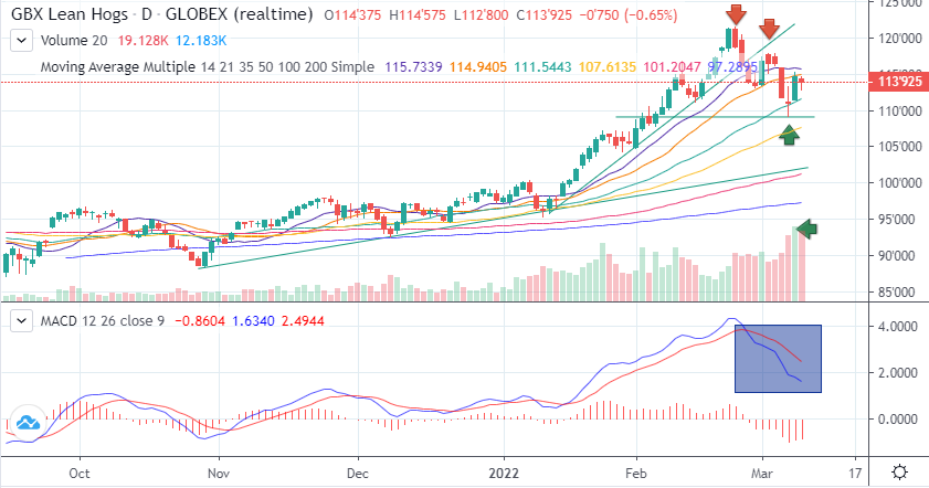 Que peut-on détecter dans le graphique de juin? Plusieurs choses! Premièrement, dans les deux journées de prix tournant autour du $120 / 100 lbs, on peut noter tout de suite une chandelle de type Dark Cloud cover (la chandelle rouge). Cette chandelle forme en plus la configuration des 3 corneilles (3 chandelles rouges consécutives). Sur le rebond de la semaine dernière (2 mars) on remarque un pendu suivi d’un doji (chandelle d’indécision) (lundi 7 mars). Le fort volume indique de cette journée indique une bataille ferme entre les acheteurs et les vendeurs. De plus, le support à $109.20 a réussi à tenir le coup. Le rebond a été violent (forte hausse des prix), mais encore aujourd’hui apparait un signe d’un petit pendu (ou même d’un harami). Le volume de contrats transigés demeure élevé et le fait que le prix demeure sous la moyenne mobile 14 et 21 jours suggère que la bataille est perdue à court terme. Le MACD (tendance momentum) suggère aussi que le marché n’est pas près d’un retournement vers la hausse et pourra retester les creux récents.