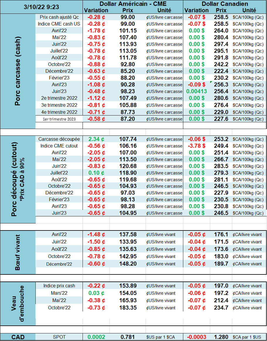 Le site www.pig333.com s’est amusé à demander aux producteurs des différents pays quel prix ils s’attendent d’avoir pour leurs porcs en 2022. Au Canada, voici le tableau des estimations. Les prédictions : prix moyen de $195.66 CAD / 100 kg. On peut comparer les attentes de l’an dernier (2021). Les producteurs étaient plutôt pessimistes aux Etats-Unis en 2021. Finalement, les prix ont été nettement meilleurs que leurs estimations.
