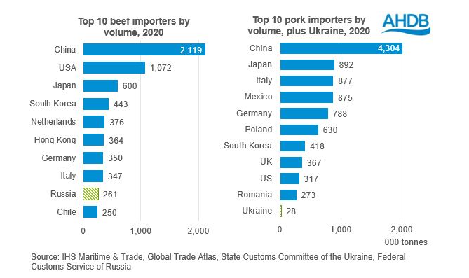 Pour le mois d’avril et mai, il est peut-être intéressant de souligner 2 phénomènes importants : 1) Les producteurs européens ont moins de débouchés pour leurs produits. L’Ukraine a importé 40 600 tonnes de viandes de porc en 2021. C’est peu, mais c’est une quantité de plus qui devra prendre le chemin des marchés mondiaux. De plus, il est bien possible que plusieurs pays de l’est européen (Roumaine, Pologne, Hongrie, etc) diminuent la consommation. Il est rare que la population impliquée dans des conflits mange des repas 5 services tous les soirs! Même chose pour la Russie. Les grandes bannières et chaines alimentaires (comme McDonald) ont fermé leurs restaurants en Russie la semaine dernière. Évidemment, les gens vont manger, mais l’incertitude crée une insécurité malsaine qui peut ralentir la consommation de viandes. Les producteurs danois, allemands, doivent donc trouver des débouchés pour leurs produits et venir jouer dans les platebandes des Américains.