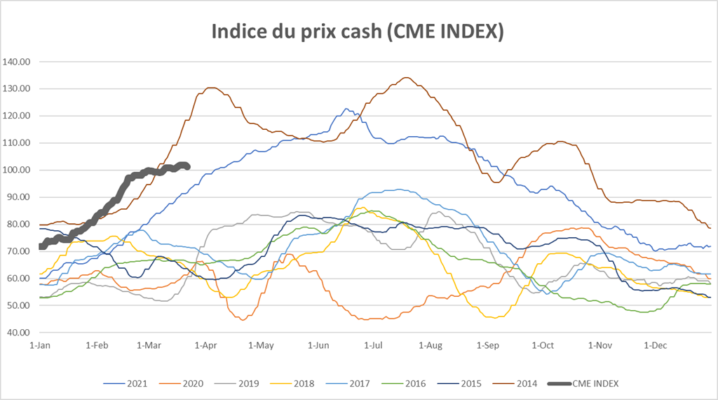 Malgré tout, le prix du porc monte et monte encore. Les contrats d’été ont même réussi à faire de nouveaux sommets. Les contrats d’automne aussi continuent sur leur lancée. Tous les jours les gens disent, il n’y plus de cochons, plus de porcelets, plus rien. Ca résume pas mal ce que pense le marché aussi avec des prix aussi élevés sur tous les mois de 2022 et 2023. Bien évidemment, il y a des porcs disponibles, mais il est vrai que la quantité abattue et à abattre est plutôt mince et pourrait encore le devenir davantage si jamais le prix des intrants demeuraient aussi élevés. Nous aurons davantage de réponses mercredi prochain…