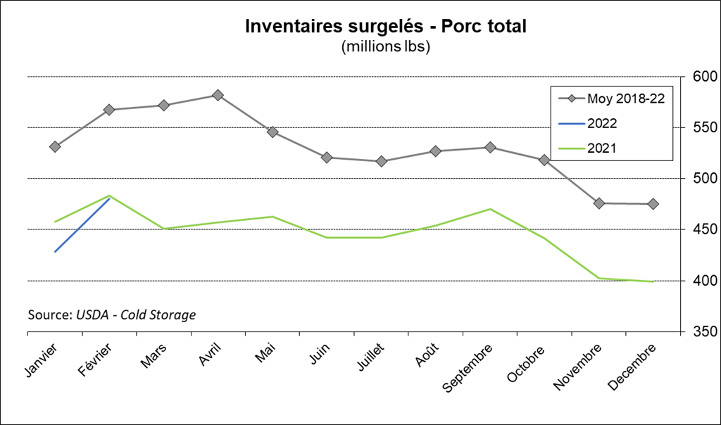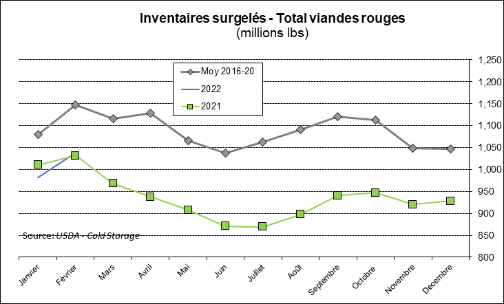 Le rapport du Cold Storage apporte une couleur différente aussi sur la consommation locale. Il est intéressant de noter une accélération de la quantité de viandes rouges dans les inventaires américains. Cette hausse n’est pas anormale, mais semble dessiner une réalité différente de celle que nous avons vécue depuis quelques mois. Oui, les inventaires montent! Mais le problème vient du fait que les inventaires grimpent tout en ayant moins de production. En février, presque systématiquement, la production était 4 , 5 ou même 6% inférieure à l’an dernier en terme de nombre d’animaux abattus. Cette augmentation des inventaires n’est pas problématique puisqu’elle ne représente qu’un mois. Si jamais la tendance devenait plus lourde dans ce sens, cela pourrait démontrer une baisse de la consommation et donc provoquer une baisse des prix à moyen terme.
