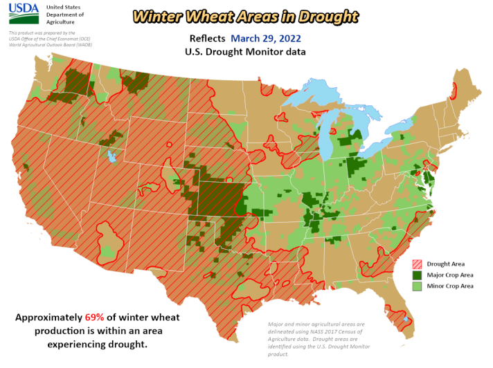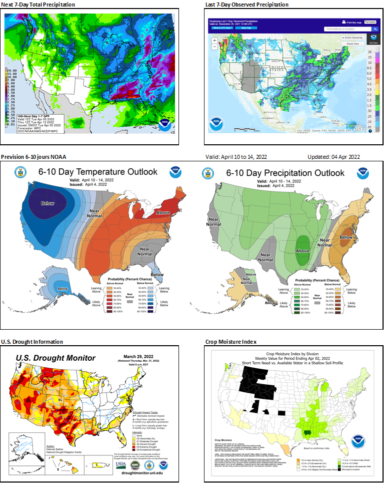 La sécheresse a fait des ravages dans les champs américains. Le blé a souffert terriblement. Par contre, (heureusement?), il est trop tôt pour en tirer une conclusion définitive car la corrélation entre la qualité du blé en avril et la taille de la récolte en juillet n’est pas la meilleure. Mais bon, ce n’est pas le temps d’avoir une mauvaise récolte dans le contexte actuel… Au 29 mars 2022, je vois que 69% du blé d’hiver était dans une zone de sécheresse. Le Kansas étant un des principaux états de production et seulement 32% du stock est de bonne qualité… Ca va prendre de la pluie pour redresser tout ça, mais malheureusement il n’en annonce pas cette semaine (je ne m’aventure pas sur le « long terme », ca change trop tout le temps!)