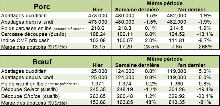 Un indice que l’offre de viande a surpassé l’offre le mois dernier (ce qui vient justifier la baisse des prix) c’est la hausse des inventaires de viande de bœuf et de porc le mois dernier. Le rapport Cold Storage a démontré que les stocks commencent à se reconstituer tranquillement. Une offre supérieure, une demande moins forte et voilà la résultat.