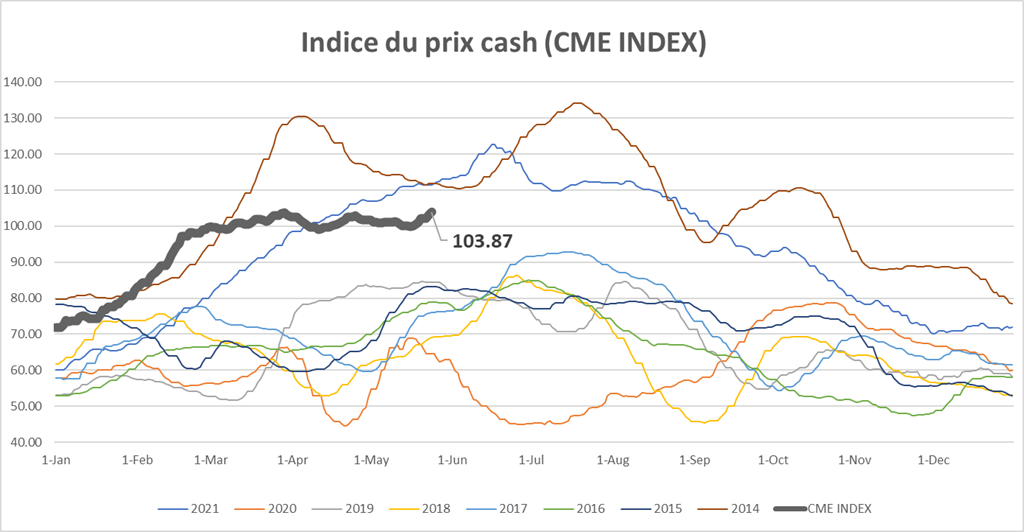 Dans le tableau ci-haut, on note que les abattages sont en baisse de 1.5% cette semaine par rapport à l’an dernier. C’est un bon signe pour les prix et les contrats à terme. Surtout que la logique voudrait que les abattoirs veuillent avoir plus de porcs cette semaine pour compenser pour le manque de production du congé férié de lundi prochain (31 mai – Memorial day). Si les abattoirs veulent plus de porcs, voudront-ils payer plus cher? Le prix au comptant monte tranquillement passant de $101 à $104 en quelques jours. Le prix de la découpe assure quelques gains passant de $ 103 à $108 / 100 livres depuis 1 semaine.