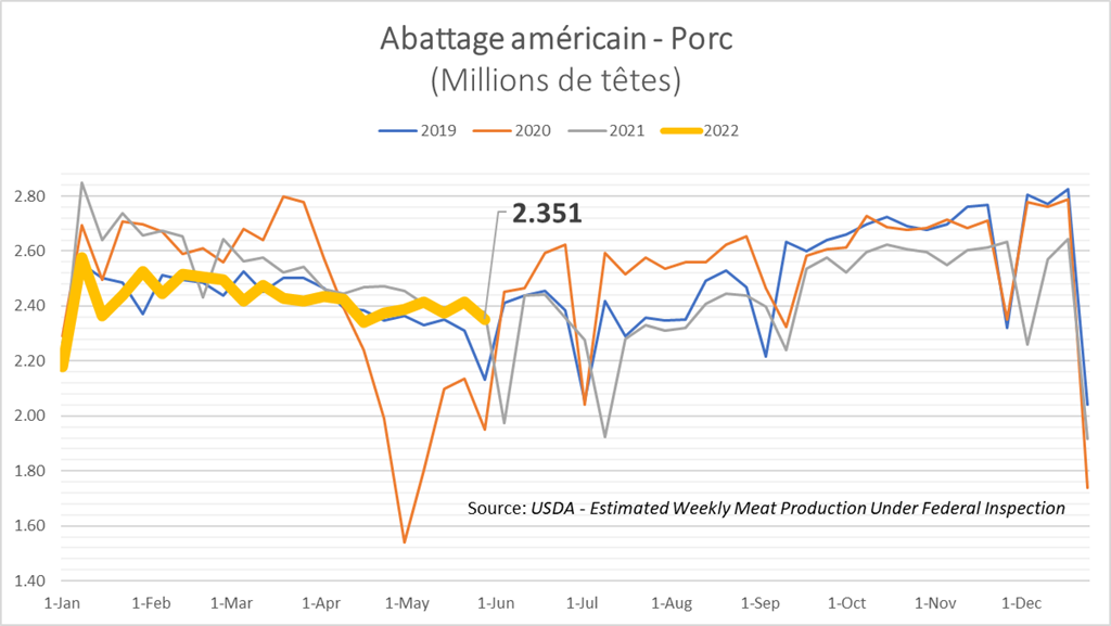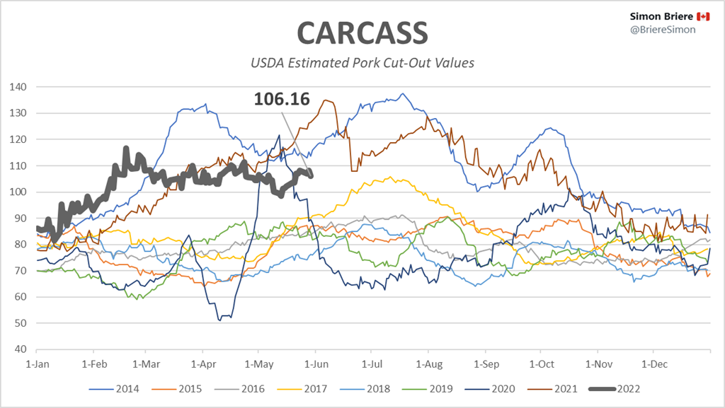 La découpe après avoir relevé la tête la semaine dernière, a perdu pied vendredi ave une baisse de 1.97 USD / 100 livres. Si on veut justifier des prix élevés cet été, il faudra que la découpe commence à grimper au cours des prochaines semaines. Il y a de la place si on se fie aux années antérieures.