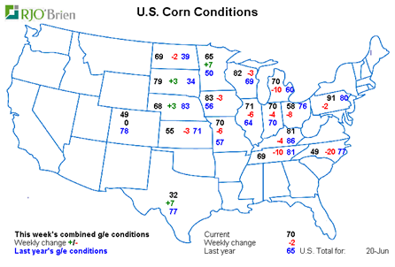 Le prix du porc navigue aussi en eaux troubles entre l’offre de porcs qui diminue et la demande qui demeure bien incertaine. Le prix des grains aussi a commencé à piquer du nez. Le USDA rapportait que la qualité de la récolte du mais à venir se maintenait dans des catégories plutôt bonnes et excellentes pour débuter la saison. Les températures sont douces pour finir la mois de juin, mais il manque de pluie dans les perspectives plus long terme. Le verdict du marché pour l’instant : bonne récolte à venir. Mais tout peut changer en juillet!