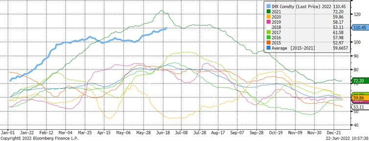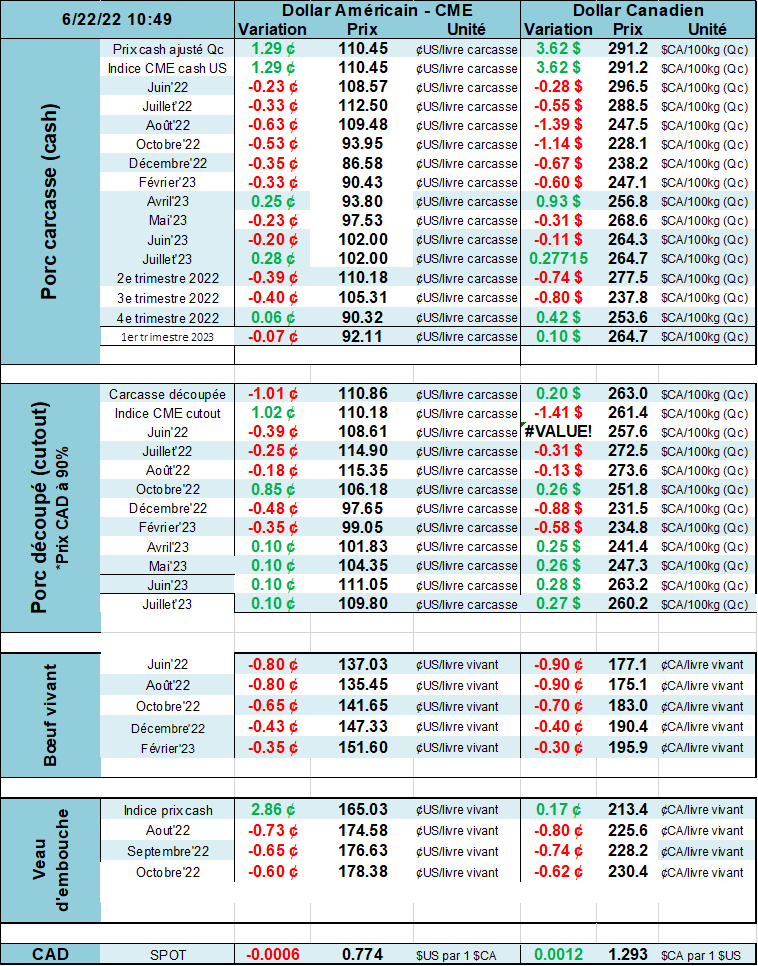 Pour revenir à l’abattage moyen aux Etats-Unis, la semaine dernière représente un point d’ancrage intéressant puisque c’est la première semaine de forte baisse du nombre de porcs abattus depuis près de 2 mois. Déjà, cette semaine, nous avons 24 000 porcs de moins abattus par rapport à la même semaine en 2021 ou 2.55% en dessous de l’an dernier. Ces petits pourcentages pourraient faire toute la différence sur le prix du porc au comptant cet été. Déjà que les contrats de juin ont été décevants, il est possible que ceux de juillet et d’août puissent nous apporter une relative rentabilité au cours des prochaines semaines. Pour cela, il faudra une bonne demande et conséquemment il faudra voir comment les données du Cold Storage pourront supporter nos attentes (rapport le 23 juin).