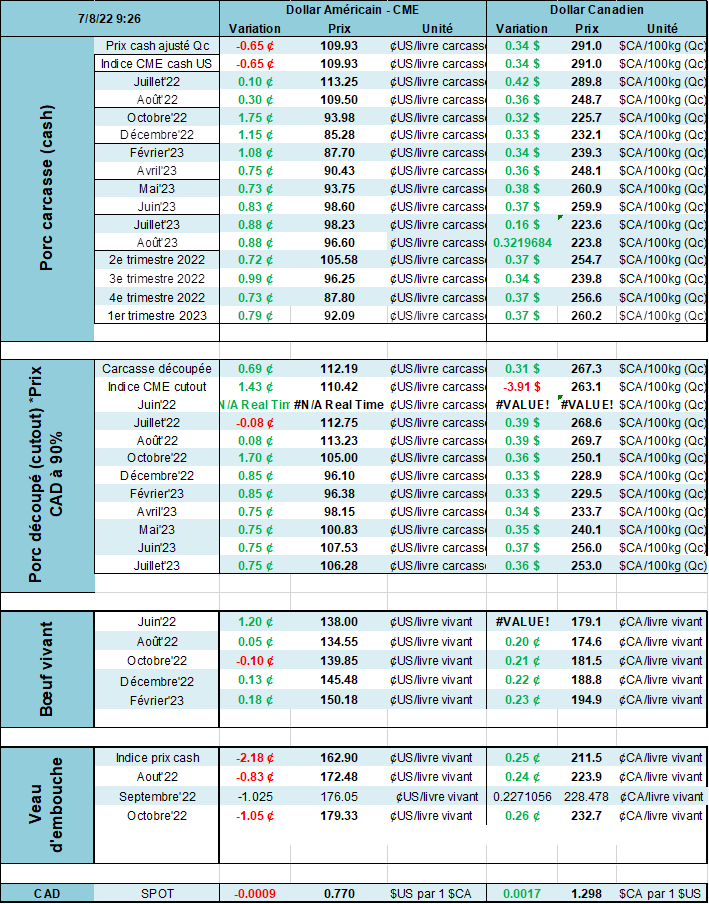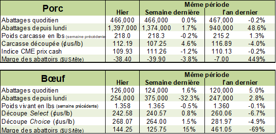 La Chine va-t-elle reprendre un programme d’importation au cours des prochaines semaines pour réduire la tension sur les prix locaux? Le USDA ce matin a rapporté que les ventes à l’exportations se chiffraient à 31 200 tonnes métriques, ce qui est bon (pas extraordinaire, mais bon somme toute). Mais le point à considérer dans ce rapport est : ‘’Qui achète et combien de tonnes?’’ La Chine était le 2ieme acheteur avec 11 400 tonnes métriques (Mexique : 16 200 tonnes). C’est la plus grosse commande de la Chine depuis plusieurs semaines. Coïncidence? Hasard? Si vous avez bien lu cette chronique, vous comprendrez que les autorités veulent du porc provenant de l’étranger pour 2 raisons : 1) éviter tout débordement de la population qui pourrait chialer sur les prix élevés et 2 ) servir une leçon aux spéculateurs locaux qui ‘’cachent’’ ou qui entreposent de la viande dans le simple but de faire de l’argent… En important de la viande cela devrait faire diminuer les prix locaux et faire diminuer le profit de ces spéculateurs….