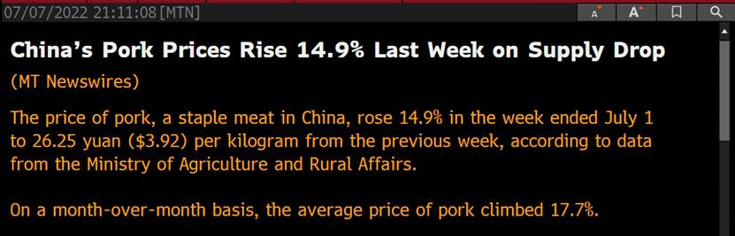Voici le genre de nouvelles qu’on lit ce matin au sujet des prix du porc en Chine. Voilà pourquoi le gouvernement central se mêle des prix depuis quelques jours.