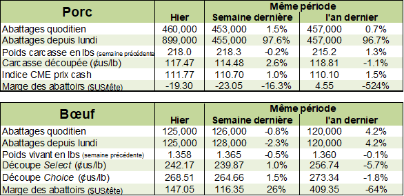 Cette semaine, le rythme d’abattage est particulièrement lent. Pour les 2 premiers journées de la semaine, le nombre de porcs abattus se chiffraient à 899 000 versus 922 000 l’an dernier. En pourcentage cela représente une baisse de 2.4% De plus, il sera intéressant de voir comment la météo affectera la production au cours de l’été. Nous avons été épargné depuis plusieurs semaines, mais on tombe dans le cœur des chaleurs estivales….