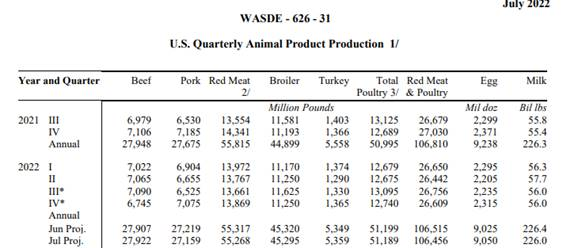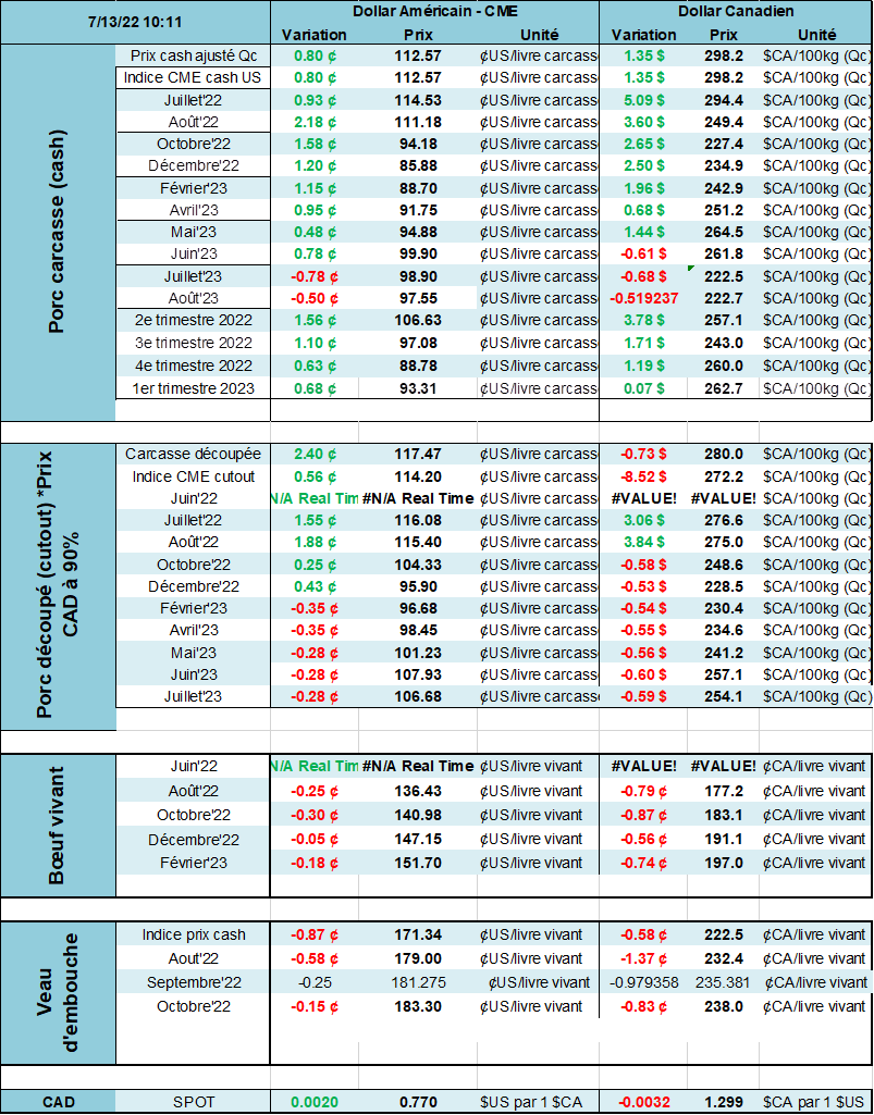 Aux Etats-Unis, le USDA a produit un rapport de grain hier. Malgré un rapport somme toute neutre, le prix des grains a chuté fortement. Je laisserai le soin à mon collègue Simon de vous parler en long et en large de ce rapport. Dans ce rapport, il y a tout de même une petite partie qui est consacrée aux viandes et à la production à venir. L’organisme a réduit un peu la quantité de viande de porc qui sera produit en 2022 par rapport aux estimations de juin. On parle d’une baisse de 60 millions de livres ou l’équivalent de 300 000 porcs. Pour mettre les choses en perspective, une journée normale d’abattage aux Etats-Unis représente approximativement 460 000 cochons. Comme on le soulignait récemment, l’industrie n’est pas en croissance cette année. Pourtant, le USDA prévoit une hausse de la production en 2023. Cela reste à voir!