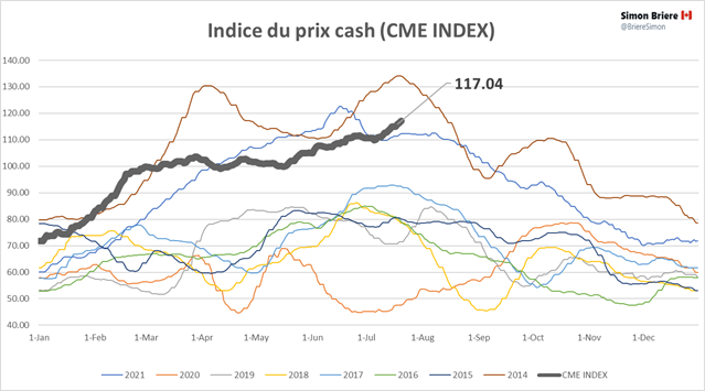 Par contre, à l’opposé de ce positif pour les prix, il faut noter que les données d’exportations furent décevantes hier. Le USDA a établi les ventes à 20 600 tonnes métriques. C’est peu, trop peu même pour justifier les prix aussi élevés à la Bourse. Les Etats-Unis sont devenus dépendants du marché d’exportation. La Chine a acheté 2500 tonnes métriques alors qu’on croyait que le pays allait être présent en raison de la hausse de son prix local. On va attendre et voir, mais si jamais le pays était encore absent dans les 2 prochaines semaines, cela voudrait dire que les autorités sont confiants de voir les prix baisser sur leur territoire. Et cette situation sera défavorable pour le prix américains.