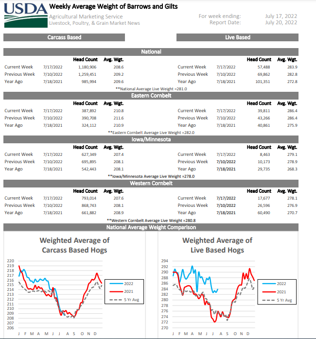 Une autre chose qui est importante à surveiller; le poids moyen carcasse des porcs abattus. Pour la première fois en 2022, nous avons des poids moyens INFÉRIEURS à 2021 dans toutes les zones sondées (National, est, ouest et Iowa-Minnesota). Moins de porcs, et ceux sont plus légers ce qui provoquent tout simplement une offre moins grande pour les consommateurs et une relative rareté.