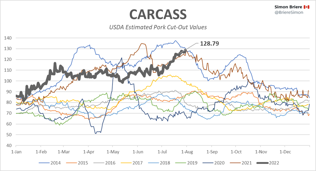 Qui achète tout ce porc? Et surtout qui paye un prix si cher ces temps-ci? Mon hypothèse demeure que, certaines acteurs / grossistes institutionnels (écoles / université / etc), placent des commandes pour les mois de septembre et octobre afin d’être prêt et essaient tant bien que mal de fixer de prix pour les prochains mois et respecter les budgets alimentaires décrétés par les paliers de gouvernements.
