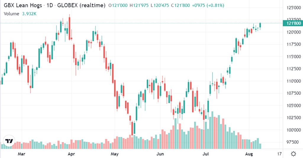 En juin et juillet, les analystes ont beaucoup parlé des prix du porc en Chine qui grimpaient. Étrangement, les contrats à terme chinois sur le porc ont perdu 3% lundi. Ceci fait suite, à des pertes de quelques pourcentages la semaine dernière. Nous suivrons attentivement si la descente se poursuit, se sera un bon indice de ce qui peut se passer en Amérique du Nord.